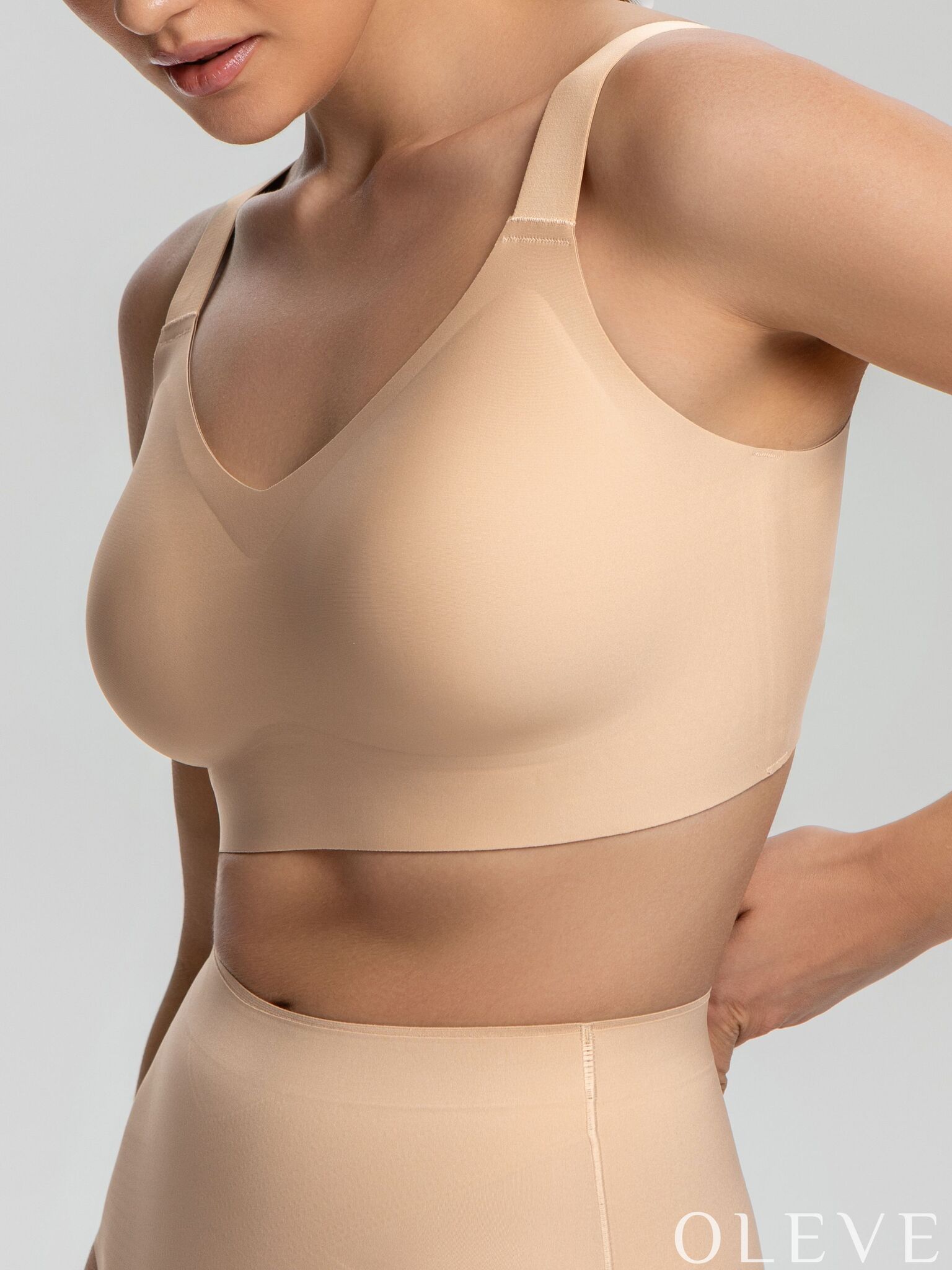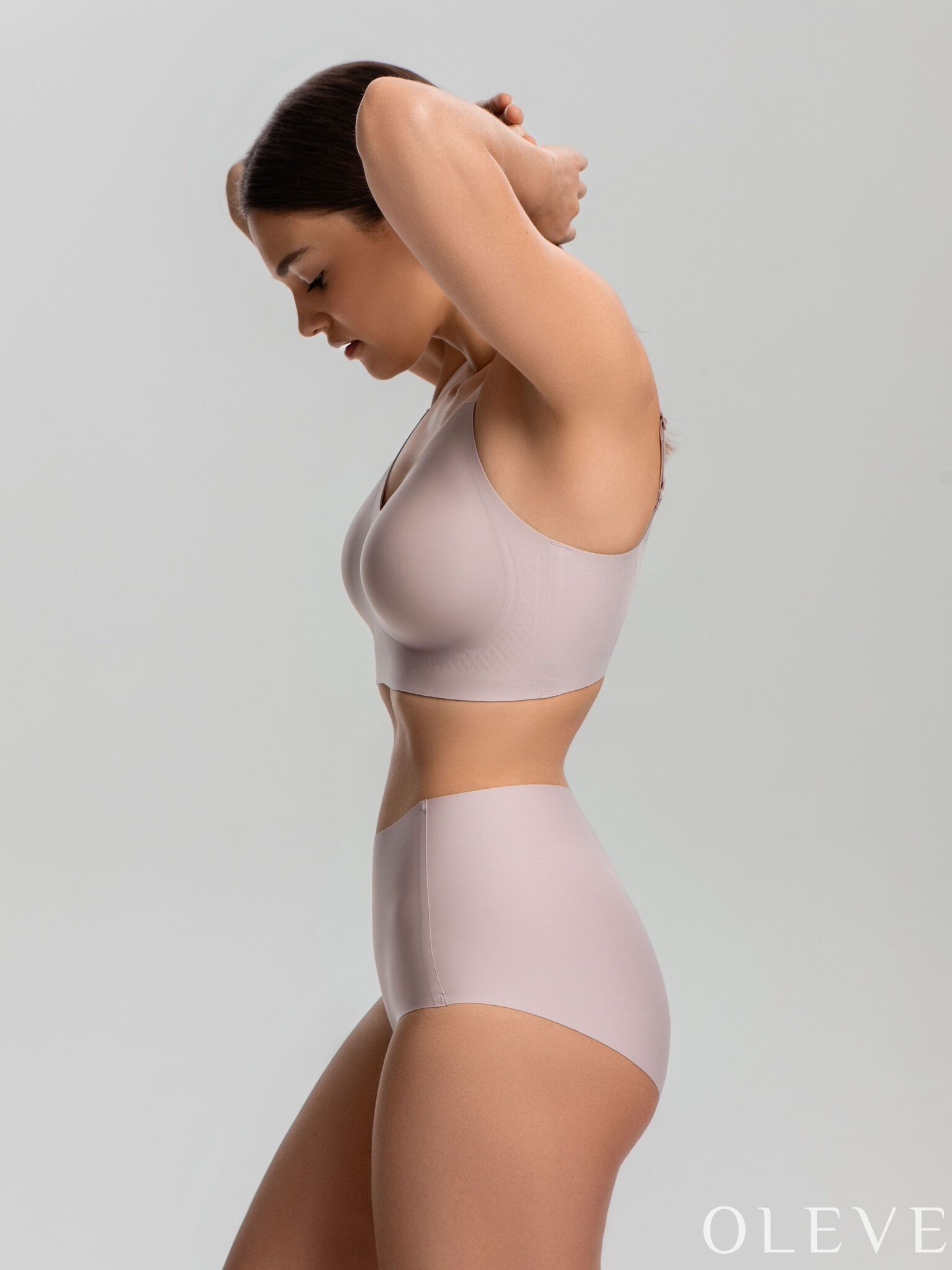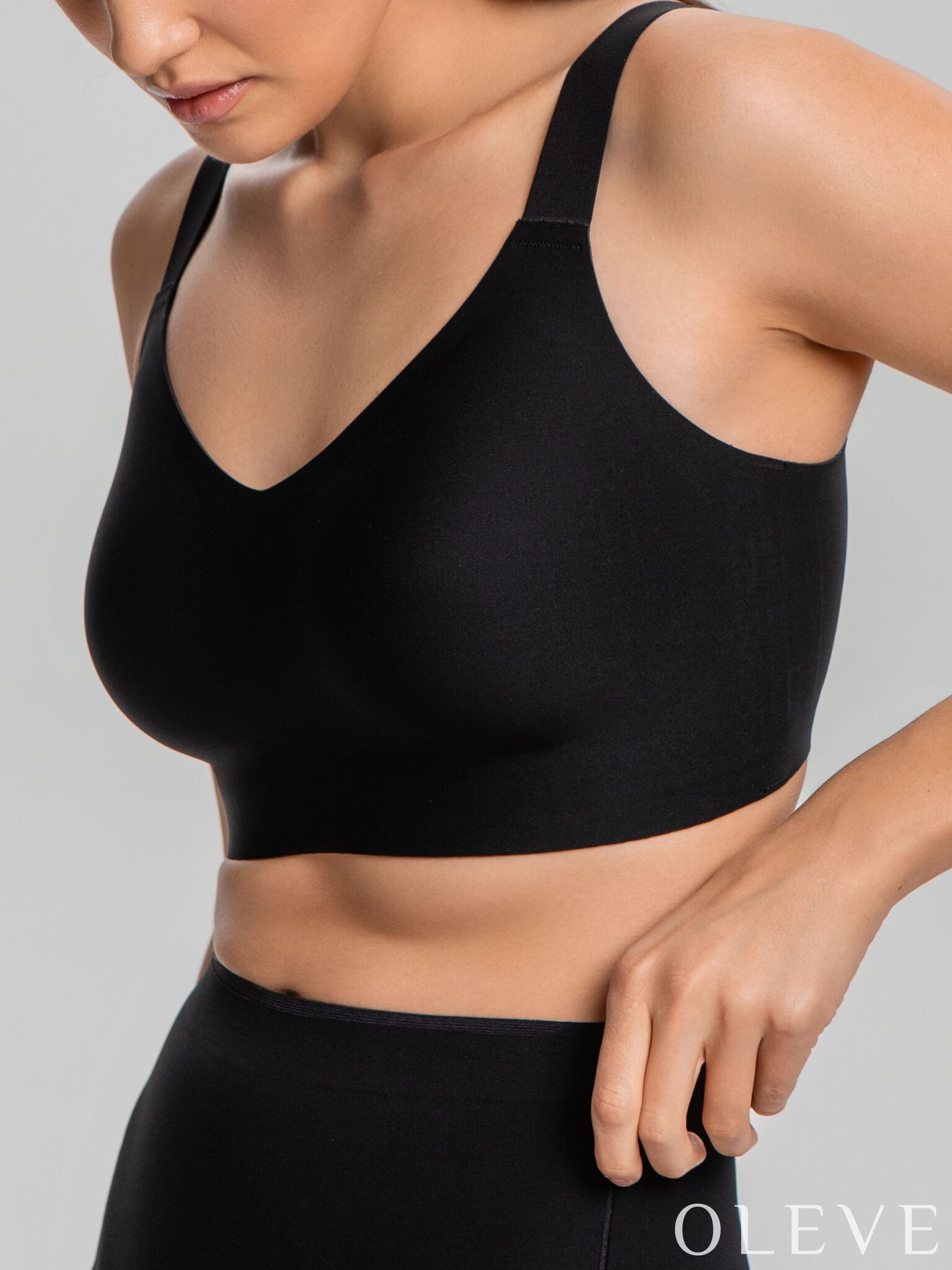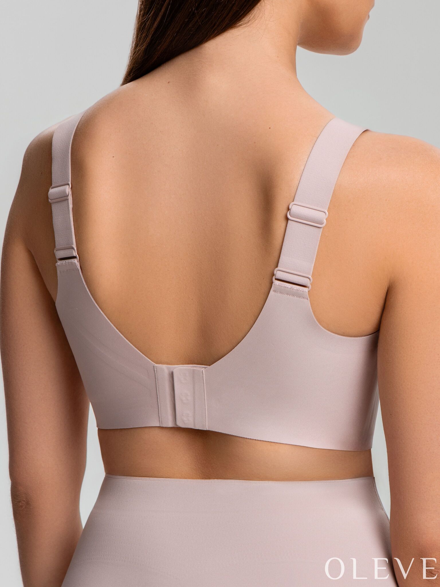 Бесшовный бюстгальтер с V-образным вырезом из микрофибры. Силиконовые вставки создают дополнительную поддержку груди. Для более комфортной и плотной посадки добавлены боковые косточки. В комплекте съёмные латексные вкладыши. Широкая спинка в форме леотард. Комфортные широкие бретели исключают натирание и сдавливание плеч.