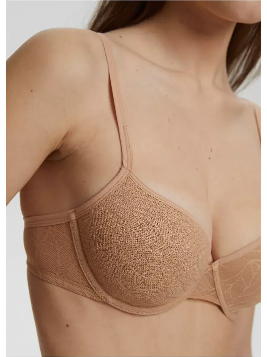 Бюстгальтер из кружевного полотна на косточках. Чашки бюстгальтера выполнены по современной технологии "спейсер" из специального дышащего немнущегося материала. Благодаря своим свойствам, он хорошо сохраняет форму, не деформируется после стирок и в то же время прекрасно пропускает воздух. Создает мягкую и естественную форму груди. Обеспечивает максимальный комфорт и удобство при носке в течение всего дня.