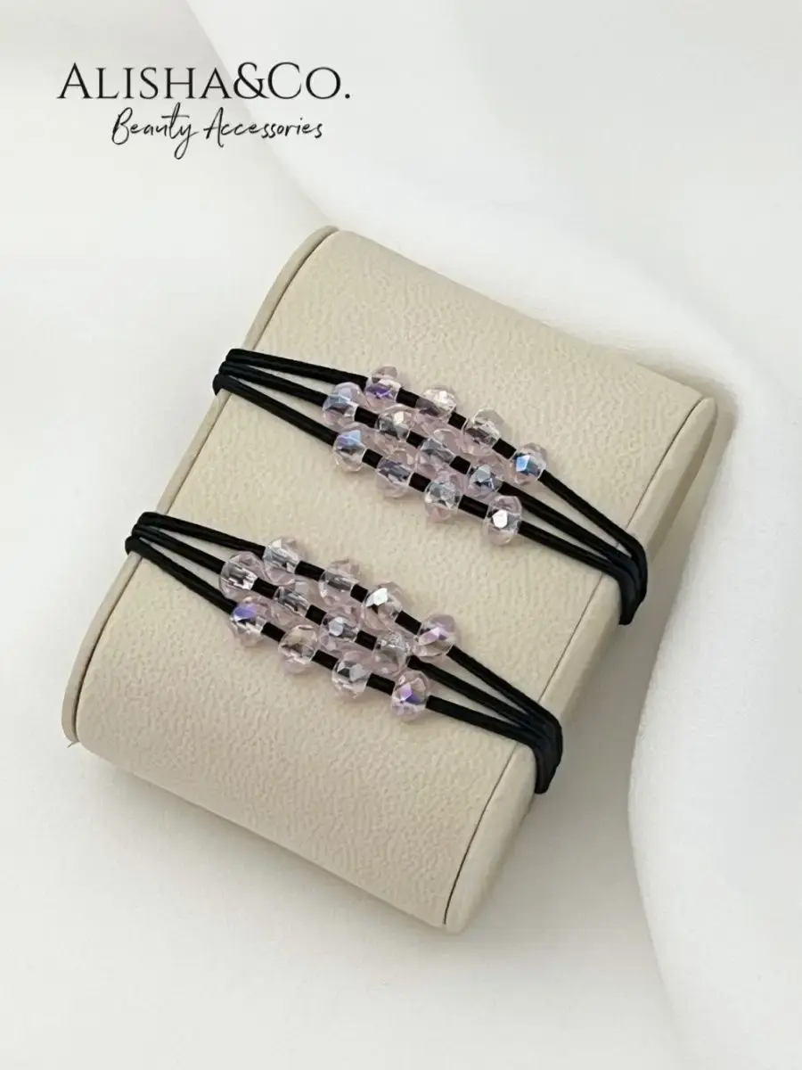 В комплект входят две изящные черные тройные резинки с 4 хрустальными бусинами-стразами на каждой из них. Аксессуар идеально подходит для повседневного использования, при этом добавляя изюминку в любой образ. Эти резинки подходят как для коротких, кудрявых, прямых волос, так и прекрасно держат самые густые и длинные волосы. Эластичная и упругая основа резинки позволяет закрепить волосы на 2-3 оборота при внутреннем диаметре 5-6 см.